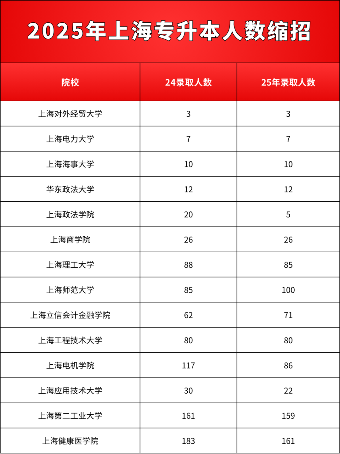 2025上海专升本各院校人数增减情况