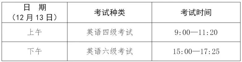 英语四级口语考试(CET-SET4)考试时间为11月22日,英语六级口语考试(CET-SET6)考试时间为11月23日,具体场次安排如下: