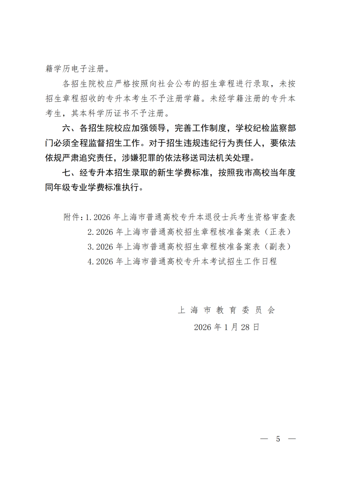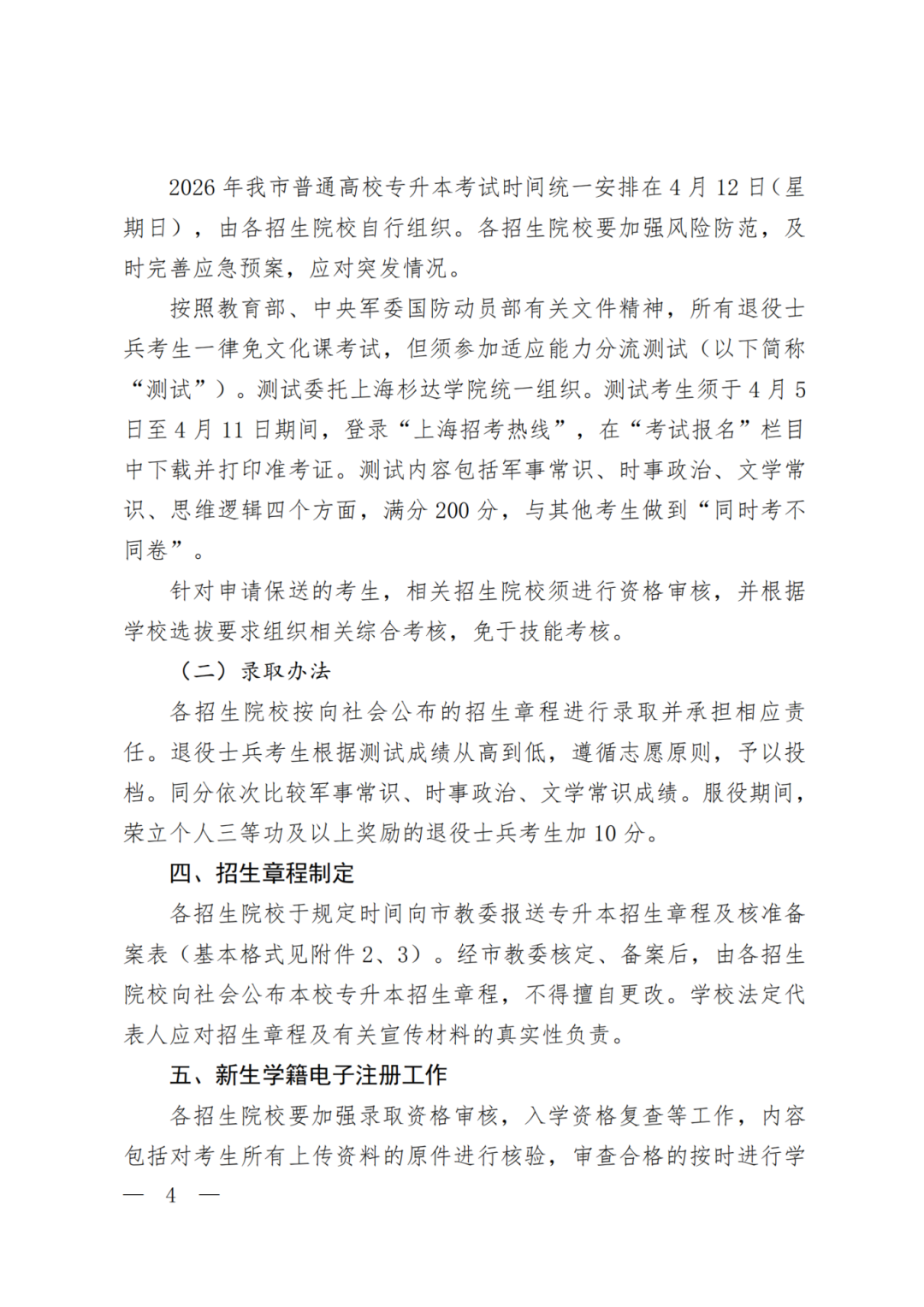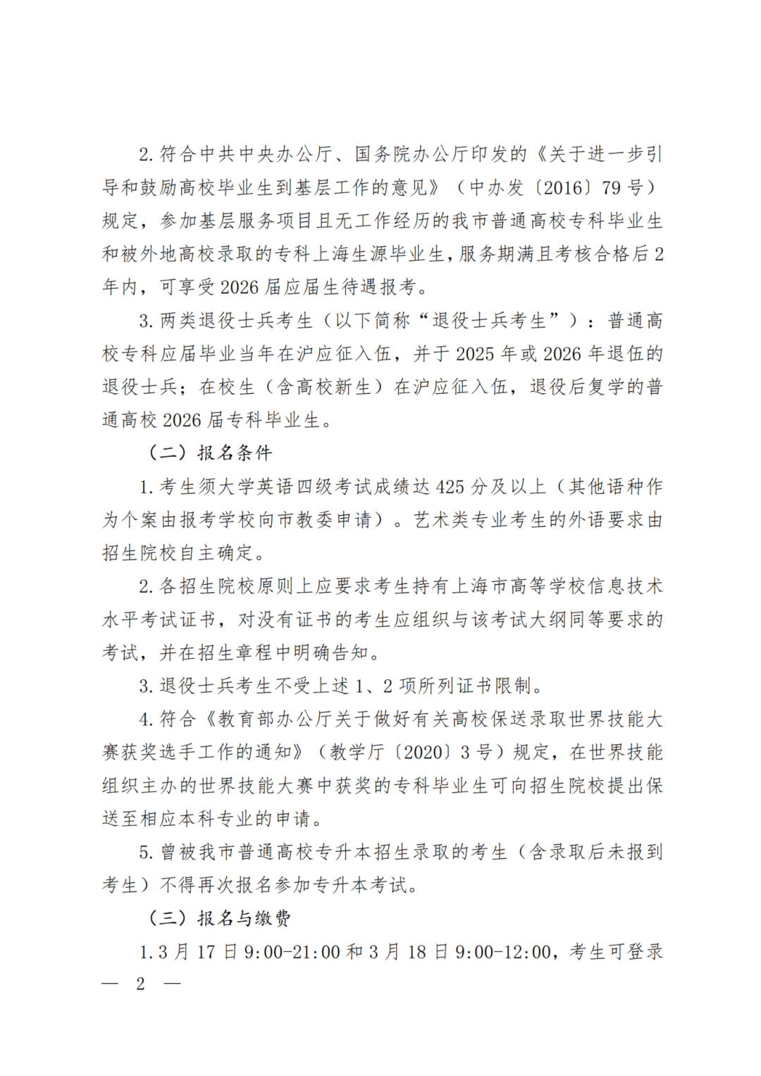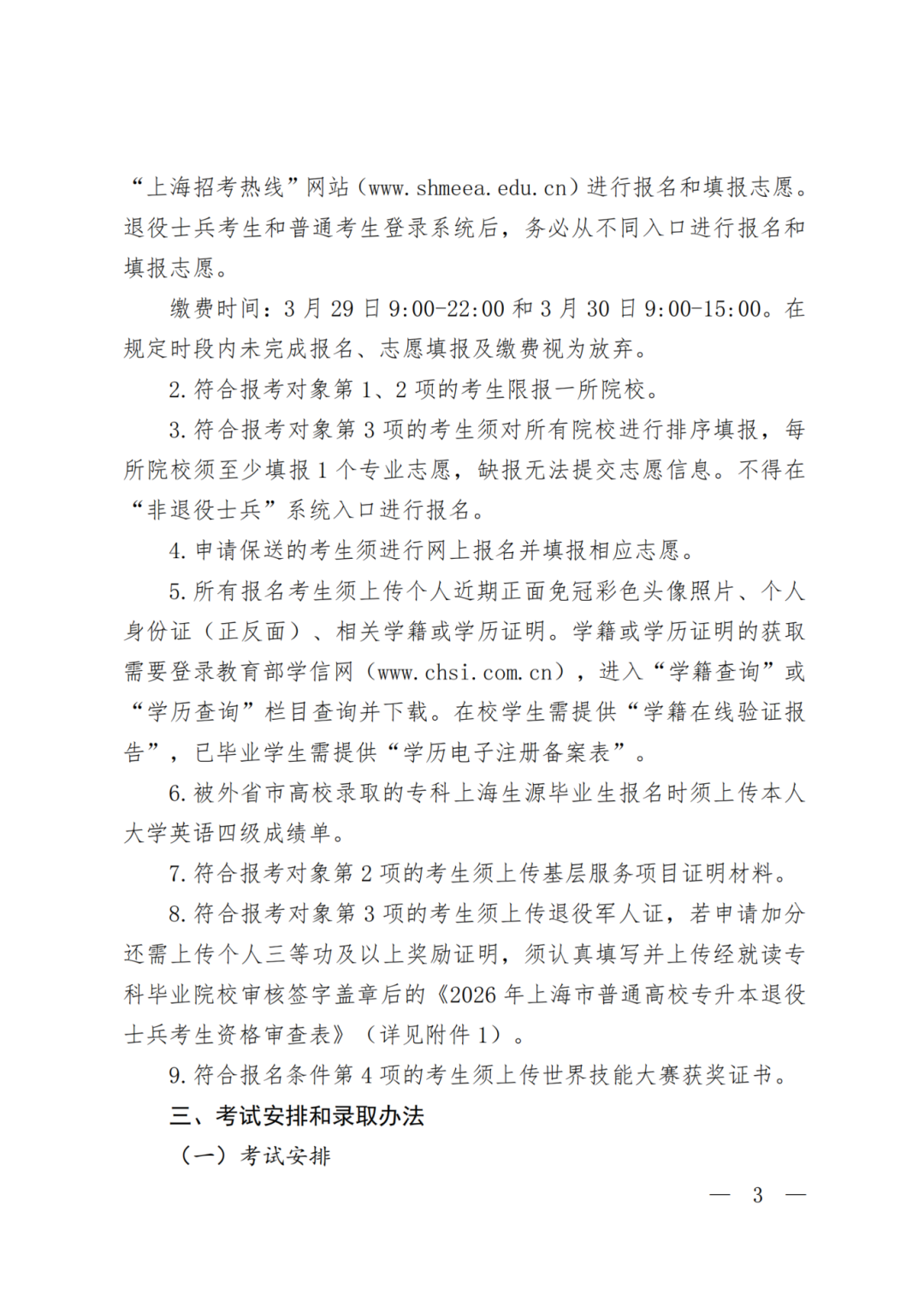 8.符合报考对象第3项的考生须上传退役军人证,若申请加分还需上传个人三等功及以上奖励证明,须认真填写并上传经就读专科毕业院校审核签字盖章后的《2026年上海市普通高校专升本退役士兵考生资格审查表》(详见附件1)。